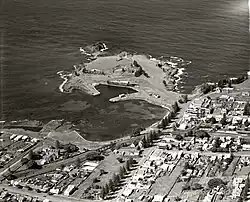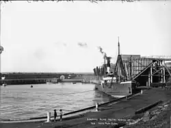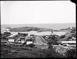 An artificial harbour was constructed in the 1880s,[19] with one breakwater running for 100 yards In a north-easterly direction and another to the south-east for 50 yards—from Cowrie Island—providing an entrance only 100 feet wide, with a depth of six feet of water.[16] The breakwater was extended westward around 1899,[20] to block completely the gap between Cowrie Island and the mainland.