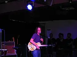 Gossard is known for his hard rhythm style of playing, and his sense of beat and groove.[51] Gossard has cited Jimmy Page and Led Zeppelin as a major influence on his style and rhythmic approach on guitar.[52] Gossard's main instrument is a Gibson Les Paul equipped with a Bigsby vibrato system.[53][54] He once said of himself: "I like rhythmic things that butt up against each other in a cool kind of way."[55] Vedder has been quoted as saying that it is extremely difficult to collaborate with Gossard, as he outright refuses to work on anything remotely like anything he's done before.[56] When the band started, Gossard and McCready were clearly designated as rhythm and lead guitarists, respectively. The dynamic began to change when Vedder started to play more rhythm guitar during the Vitalogy era. McCready said in 2006, "Even though there are three guitars, I think there's maybe more room now. Stone will pull back and play a two-note line and Ed will do a power chord thing, and I fit into all that."[57]