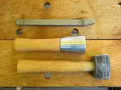 When he or she is ready to carve, the carver usually begins by knocking off, or "pitching", large portions of unwanted stone. For this task, he may select a point chisel, which is a long, hefty piece of steel with a point at one end and a broad striking surface at the other. A pitching tool may also be used at this early stage; which is a wedge-shaped chisel with a broad, flat edge. The pitching tool is useful for splitting the stone and removing large, unwanted chunks. The sculptor also selects a mallet, which is often a hammer with a broad, barrel-shaped head. The carver places the point of the chisel or the edge of the pitching tool against a selected part of the stone, then swings the mallet at it with a controlled stroke. He must be careful to strike the end of the tool accurately; the smallest miscalculation can damage the stone, not to mention the sculptor’s hand. When the mallet connects to the tool, energy is transferred along the tool, shattering the stone. Most sculptors work rhythmically, turning the tool with each blow so that the stone is removed quickly and evenly. This is the “roughing out” stage of the sculpting process.