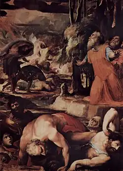 Fire sent down from heaven on Korach, Datan, and Aviram | 1539 | 197x139 cm | The screaming bearded man on the left may be a self-portrait of the painter. |