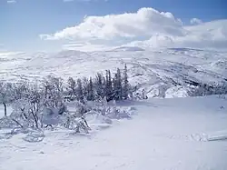 Storlien's climate is a maritime-influenced subarctic climate. Considering it being a ski resort, Storlien has a relatively mild winter climate, being influenced by the North Atlantic and its warming influence. This means that in spite of the relatively high elevation Storlien averages milder winters than the coastline of the Bothnian Bay on the east coast. It is also the Swedish weather station closest to the main Atlantic, if weather stations located by the shores of Kattegat and Skagerrak are excluded. Summers are also influenced by the elevated North Atlantic air with cool daytime temperatures and very cool and sometimes cold nights. Storlien receives plenty of precipitation by Swedish standards, peaking in July, August and September.[12] However, winter precipitation is still significant enough to nearly guarantee skiing conditions. Especially during milder winters dominated the North Atlantic low pressure systems, snow accumulation can be very high. In May 2020, 148 centimetres (58 in) of snow was remaining on the ground in spite of being during late spring.[13]