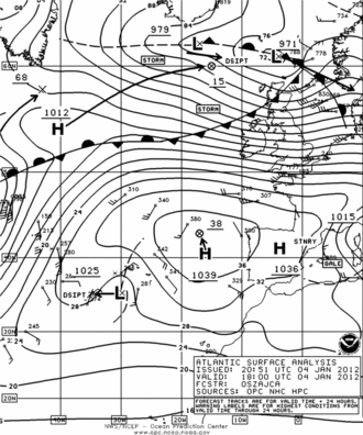 ![]() Meteorological map of 4 January 2012, with Andrea heading towards the North Sea. | |