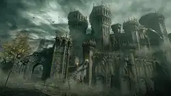 Stormveil Castle is a fictional castle depicted in the 2022 action role-playing game Elden Ring, developed by FromSoftware. It is the game's first "legacy dungeon", a self-contained dungeon crawl designed to be reminiscent of earlier games in the Dark Souls series. As such, it also functions as a tutorial for the game's mechanics. Located in the Limgrave area of the Lands Between, the continent upon which Elden Ring is set, Stormveil's ruler, Godrick the Grafted, is a demigod who has fallen into disrepute due to his practice of "grafting", a form of biological augmentation using the severed body parts of other beings. The castle is seen covered in organic thorns and pockmarks, signs that it is being consumed from beneath by Godwyn, a former demigod who has become the "Prince of Death" in his undead state. All of its soldiers and guards have long since lost their minds following the shattering of the Elden Ring.