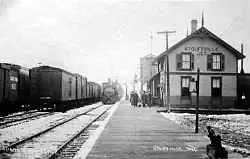 The Toronto and Nipissing Railway was completed in 1871, connecting Stouffville and Uxbridge with Toronto. The line's northeastern terminus at Coboconk, Ontario, on Balsam Lake in the Kawarthas was completed in 1872.[4] In 1877, a second track was built from Stouffville north to Jackson's Point on Lake Simcoe. These connections were created in large part to provide a reliable and efficient means of transporting timber harvested and milled in these regions.[5] Soon Stouffville Junction serviced thirty trains per day.[6] The railway became the Grand Trunk Railway in 1884, and Canadian National Railways took over the line in 1914.[7]