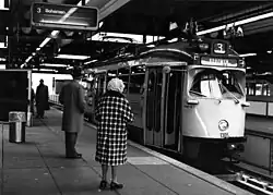 A proposal by Friedrich Lehner from 1964, was formalised in 1969, in a document called Nota Openbaar Vervoer 1969 (lit. 'Memorandum, public transport, 1969').[8][9] This memorandum contained plans for a new Central Station, urban rail transit to satelite town Zoetermeer and a proposal including a combination of new tunnels and viaducts to improve tram operations,[10] described as 'semi-metro'. In 1973, The Hague's new Central Station was opened, to accommodate the growing number of passengers.[3] The new station would get new elevated tram tracks with platforms above the station concourse in 1976.[11]