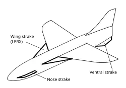 On both supersonic and subsonic types, smaller strakes are sometimes applied to the forward fuselage to control the fuselage flow at high angles of attack; for example, the Concorde had small nose strakes "to get a better directional stability".[1]