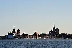 Stralsund (German pronunciation: [ˈʃtʁaːlzʊnt] ⓘ; Swedish: Strålsund),[3] officially the Hanseatic City of Stralsund (German: Hansestadt Stralsund), is the fifth-largest city in the northeastern German federal state of Mecklenburg-Western Pomerania after Rostock, Schwerin, Neubrandenburg and Greifswald, and the second-largest city in the Pomeranian part of the state. It is located on the southern coast of the Strelasund, a sound of the Baltic Sea separating the island of Rügen from the Pomeranian mainland.[4]