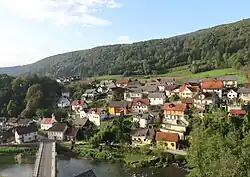 Stranska Vas pri Žužemberku stands on a terrace on the right bank of the Krka River, opposite Žužemberk Castle.[1] It is connected to Žužemberk by a bridge across the river. Bačknica Hill (508 meters or 1,667 feet) and the Žužemberk Woods (Žužemberški boršt), also known as the Town Woods (Trški boršt), stand southwest of the village. There is a walled spring near the summit of Bačknica Hill known as Bačkin studenec.[3]