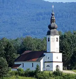 There are two churches in Stranska Vas pri Žužemberku. Saint Nicholas on the Bank Church (Cerkev sv. Nikolaja na Bregu) is a chapel of ease with a polygonal chancel dating from the 14th century. The church was remodeled in the Baroque style in the 17th century. It stands on the right bank of the Krka River.[6] Saint Roch's Church stands on a hill southeast of the village. It is an early Baroque single-nave church that was built in 1626 with an octagonal bell tower dating from 1693. The nave was vaulted in 1871. The main altar in the church dates from 1693, and the church is a pilgrimage destination.[1][7]
