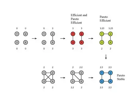 Pareto efficiency is another efficiency concept used by economists to study the overall social welfare. A network is Pareto efficient relative to (,... ) if there does not exist any such that () () for all with strict inequality for some .[3]: 206 The Pareto efficiency notion is more reasonable in settings in which allocation rules are fixed.[3]: 32 A network can Pareto dominate another network if it has strictly larger benefits for one individual and weakly larger benefits for all individuals. If there exists a network which is not Pareto dominated by another network then it is a Pareto efficient network. In the figure "An Example of Efficient, Pareto Efficient, and Pairwise Stable Networks in a Four Person Society" an example with four players is given, where the payoffs of the players are noted by the numbers next to the nodes. If an arrow is pointing away from a network, it means that the network is not stable, since there would be benefit from deleting a link from a player or by creating a new link from two players of the network. The network in red is Efficient and Pareto efficient, since all the other link combinations offer lower payoffs to some of the players. The network in green is Pareto efficient since the payoffs are higher but it is not pairwise-stable because the players that have created only one link would also benefit by adding links to one another. The only Pairwise Stable network in the figure is the dark blue colored one since none of the players involved would benefit by deleting or creating a link.