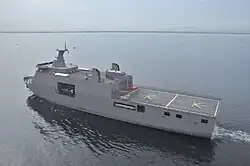 Initially a separate project from the Strategic Sealift Vessel, the Department of National Defense (DND) was rushing the acquisition of one or two multi-role vessels (MRV) for the Philippine Navy through government-to-government contract at a cost of 5 to 10 billion pesos. Initially the reported source of the said ships is either South Korea or Singapore.[10] Previous statements and news reports indicate that the multi-role vessels are comparable to landing platform docks operated by foreign navies like the Singaporean Endurance class or the Spanish Galicia class.[11] It was later confirmed that the ship would be from South Korea[12] and is a variant of the Indonesian Navy (TNI-AL) Makassar-class LPD, and is packaged with four units Samsung Techwin KAAV-7 amphibious assault vehicles (AAV), two units Daesun 23-meter (75 ft) landing craft utility LCU-23, four units of 9.8-meter (32 ft) rigid-hulled inflatable boats, one unit truck-based mobile hospital, two units Kia KM-250 21⁄2-ton troop trucks, two units Kia KM-450 11⁄4-ton troop trucks, two units Kia KM-450 ambulances, two units Kia Retona 1⁄4-ton utility vehicles, and one unit forklift/cargo handling equipment.