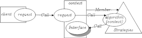 Instead, Context refers to the Strategy interface for performing an algorithm (strategy.algorithm()), which makes Context independent of how an algorithm is implemented.