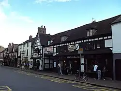 Many of the town's earliest and most important buildings are located along what is known as Stratford's Historic Spine, which was once the main route from the town centre to the parish church. The route of the Historic Spine begins at Shakespeare's Birthplace in Henley Street. It continues through Henley Street to the top end of Bridge Street and into the High Street where many Elizabethan buildings are located, including Harvard House. The route carries on through Chapel Street where Nash's House and New Place are sited. Opposite New Place was The Falcon Hotel (now Hotel Indigo), at the corner of Scholars Lane. It is a timber-framed house with nearly 100-ft frontage to the street and dating perhaps from the end of the 15th century.[25] The Historic Spine continues along Church Street where the Guild buildings are located dating back to the 15th century, as well as 18th- and 19th-century properties. The route then finishes in the Old Town, which includes Hall's Croft and the Holy Trinity Church.[21]