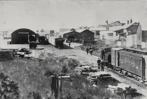 The railway reached Stratford in late 1879 during the construction of the New Plymouth line. The section from Inglewood to Stratford opened on 17 December 1879,[1][2] marking the beginning of rail service to the nascent township. Three return services were run from New Plymouth on opening day (with return tickets at one-way fares) to allow sightseers to view the newly opened countryside.[3]