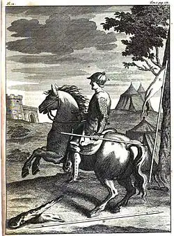 Since many stradioti wore a particular cap, in Venice the name cappelletti (sing. cappelletto) was initially used as a synonym for stradiotti or albanesi.[10][11][12][13] In the 16th and 17th centuries the term cappelletti was mainly used for light cavalry recruited from Dalmatia.[14] A feature that distinguished the cappelletti form the stradiotti was their increasing usage of firearms.[15] From the 17th century Venice recruited light cavalry no longer from the Morea, but mainly from Dalmatia and Albania,[14] and the cappelletti gradually replaced the stradiotti.[16] However they had not the same success as light cavalry was gradually abandoned.[17]