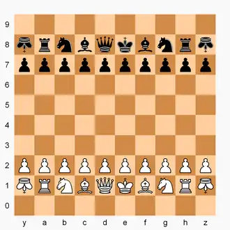 The starting setup is as shown. The standard conventions of chess apply, including normal castling and en passant. Pawns promote on the 9th ranks (ranks 1 and 8 in the diagram), and may promote to missile. The missile moves and captures as a chess king: one step in any direction. It may be captured like any other piece.