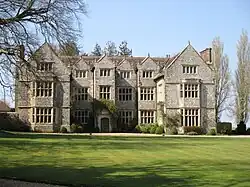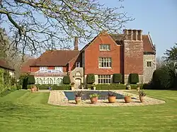 Streat Place is a manor house built in the early 17th century, next to the church, by Walter Dobell who died in 1624. It is a huge Jacobean mansion of flint, with stone details and a Horsham stone roof. In an otherwise modest place such as Streat, this upmarket manor house seems rather incongruous and perhaps it is not surprising that it was let as a farmhouse for a long time.[6] The building has an E-shaped plan with central porch and projecting wings.[9] Its national listing gives it as Grade II* and reveals its architectural merit as including its entire facing of knapped flints with long and short ashlar quoins to each window bay.[10]