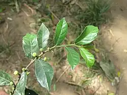 Streblus asper is a species of flowering plant in the family Moraceae.[2][3] This tree is sometimes referred to by the common names Siamese rough bush, khoi, serut, and toothbrush tree. It is a medium-sized tree native to dry regions in the Andaman Islands, Assam, Bangladesh, Cambodia, South-Central and Southeast China, East and West Himalaya, Hainan, India, Indonesia, Java, Laos, the Lesser Sunda Islands, Malaysia, Myanmar, Nepal, the Nicobar Islands, Pakistan, the Philippines, Sri Lanka, Sumatra, Thailand, and Vietnam.