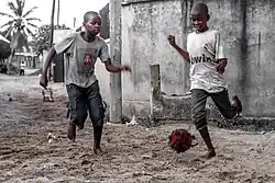In some cases, a standard ball is not available and street football depends on a ball made out of garbage, such as discarded plastic.[10][11] Handwalla Bwana, describing street football in the Kakuma refugee camp said "We used to make a garbage ball. We used to go through the garbage cans and make as much soccer ball as we could" and attributed use of the garbage ball to being better with his feet.[12][13] Johan Cruyff has said "Footballers from the street are more important than trained coaches."[14]