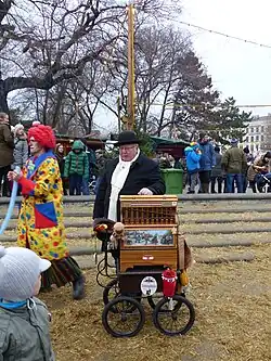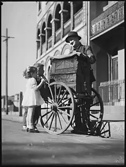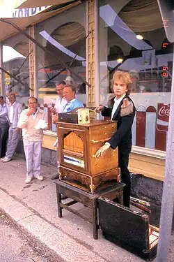 In many towns in Europe the barrel street organ was not just a solo performer, but used by a group of musicians as part of a story-telling street act, together with brightly coloured posters and sing-along sessions.[3] In New York City, the massive influx of Italian immigrants led to a situation where, by 1880, nearly one in 20 Italian men in certain areas were organ grinders.[4]