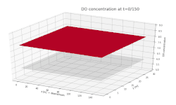 Surface plot depicting the dissolved oxygen (DO) concentration in a river. DO is shown on the vertical axis, with the along-stream and cross-stream directions on the x and y axes, respectively. A continuous input of biological material is added to the river at x = 75 m, y = 15 m, beginning at t = 0.