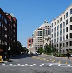 Originally King Street until the 1790 De Witt plan, it then became Lion Street. It was the beginning of the "King's Highway", a series of paths to Schenectady. Washington Avenue begins in the east at Eagle Street and from there it is New York Route 5 until the Y-intersection where Central Avenue splits to the north-east, NY 5 then follows Central. Washington Avenue from Quail Street to Manning Boulevard was in the late 1890s given by the state to the Washington Park Board of Commissioners to improve as a "speedway" or "public driveway".[11] Today many important locations sit along Washington Ave such as the New York State Capitol, New York State Education Building, the Alfred E. Smith Building, One Commerce Plaza, downtown campus of SUNY Albany, the Albany High School, the W. Averell Harriman State Office Building Campus, and the uptown campus of SUNY Albany. At Fuller Road, Washington Avenue becomes Washington Avenue Extension (NY Route 910D), to New Karner Road (NY Route 155). The extension is a four-lane divided highway with at-grade crossings and access roads flanking the road hosting office parks and Crossgates Commons. Crossgates Commons is home to the largest Walmart in the United States.[12] There is one limited-access exit, it allows access to and from Crossgates Mall in the neighboring town of Guilderland.