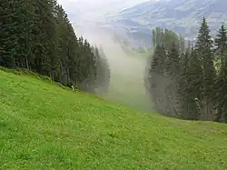 It runs on natural terrain (pasture in summer) with minor modifications done over the years, adjacent to the "Ganslern" slalom course.
