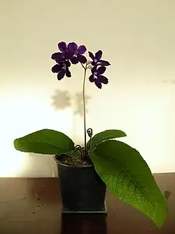 Although generally referred to simply as "Streptocarpus" or "Streps", the common name for subgenus Streptocarpus is Cape primrose, referring to the nativity of several species to South Africa and their superficial resemblance to the unrelated genus Primula. The common name for subgenus Streptocarpella is nodding violet. Streptocarpus sect. Saintpaulia ("African violet") is a separate section within Streptocarpus subgenus Streptocarpella.[6]