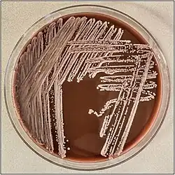 Streptomyces is the largest genus of the Actinomycetota and is the type genus of the family Streptomycetaceae.[3] These are Gram-positive bacteria with high GC content[3] and are characterised by a complex secondary metabolism.[4] They produce over two-thirds of the clinically useful antibiotics of natural origin.[5] Streptomycetes are found predominantly in soil and in decaying vegetation, and most produce spores. Streptomycetes are noted for their distinct "earthy" odor which results from production of a volatile metabolite, geosmin.[4]