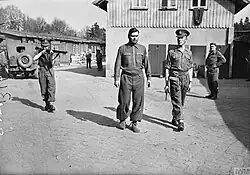 Josef Kramer, former commandant of Natzweiler-Struthof, in leg irons at Belsen before being removed to the POW cage at Celle, 17 April 1945