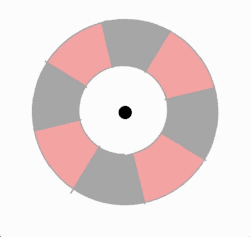 The sectored gray disk steps around clockwise. The thin gray spokes never change their brightness or position, yet they appear to drift around counterclockwise. When a sector that matches the spoke luminance jumps across the spoke, the spoke adheres first to one sector, then to the next sector located counter-clockwise. The locus of these tiny counterclockwise movements runs clockwise around the rotating disk. Paradoxically the visual system is more sensitive to these tiny moving spokes than to the far larger moving sectors.