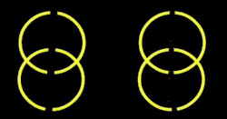 The two chopstick lines can be bent around into two circular rings, again moving CW in counterphase. Instead of terminators the rings have small gaps as in a Landolt C. If these gaps rotate with the rings, the rings appear to be glued together into a single rotating figure-8. But if the gaps float so that they are always at the 12 o'clock position then the stimulus looks like two separate rings that slide over one another. The small change in the local gaps has a large effect upon the global percept. Observers can readily track the moving intersections in the single figure-8, but their eyes slide off the intersections of the sliding rings and their eye tracking fails.