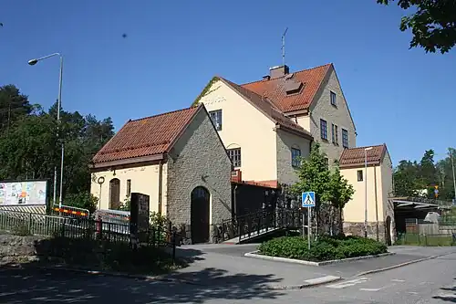 The station was originally opened in 1918 as a local stop along the Western Main Line after a residential area started developing.[2] The "Stufstabolaget" local development company financed the station's construction and later transferred ownership to Swedish State Railways (SJ), a common practice for suburban stops in the Stockholm area.[3] The first station building, designed by Folke Zetterwall and completed in 1917-1918, still exists today but serves other purposes such as community activities.[4] A new station building was constructed in 1958 but was demolished in the 1980s when the railway was expanded to four tracks.[5]