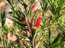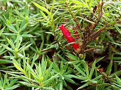 Styphelia humifusa grows as a spreading mat-like shrub up to 50 cm (20 in) high and 0.5 to 1.5 m (20 in to 5 ft) across.[2] Its hairy stems bear blue-green pine-like acute leaves 0.5-1.2 cm (0.2-0.5 in) long. The tubular flowers are up to 2 cm (0.8 in) long and appear from February to June, and are all red, unlike the red and green flowers of A. pinifolium. Flowers are followed by green globular berries around 0.4-0.6 cm (0.2 in) in diameter, which become reddish as they ripen.[3]