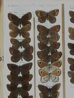 E. nerine Frr. (= goante H Schaff (37 a, b). The upperside dark black-brown with slight gloss. The red-brown transverse band of the forewing is posteriorly interrupted by the veins, forming 3—4 basally somewhat pointed spots; sometimes the band is continuous, which is nearly always the case in the male. There are 2 white-centred black ocelli anteriorly in the band. The band is interrupted by the veins on the hindwing and bears 3 smaller ocelli. The forewing beneath bright russet-red, darker towards the base, the costal and distal margins being black-brown: the ocelli as above. The hindwing beneath dark brown as far as the centre, this area being bordered by a whitish grey narrow band which is somewhat sinuate near its centre; the ocelli in the lighter distal area are mostly indicated by small black-bordered white dots, which are sometimes absent. The ground-colour of the female is lighter, the band of the forewing broader and russet-yellow, the 2 eyes at the apex larger and usually confluent, there being often two additional smaller ocelli towards the hindmargin. The ocelli placed in the band of the hindwing are also larger and have conspicuous white pupils. The forewing beneath is light russet-yellow, darkened towards the base, the costal and distal margins grey-brown, the apex dusted with white-grey The hindwing beneath white grey irrorated with brown atoms; the white-grey band, which limits the dark basal area, contrasts distinctly. The fringes chequered in the female, the distal margin of the hindwing slightly dentate. In the Central and Southern Alps, northward to the Fern Pass and Scharnitz Valley. — reichlini H Schaff (= styx Frr.), from the Bavarian Alps, Reichenhall and the Glockner district, is usually somewhat larger than the first described form. The band of the forewing is strongly reduced. The hindwing with 3 small ocelli in russet red spots. — italica Frey from the Alps of Wallis and North Italy, is a transition from nerine towards reichlini. — In stelviana [now synonym of Erebia pluto Curo, from Bormo, the red band of the forewing is continuous, the underside devoid of ocelli, being paler and basally but indistinctly dusted with white. — morula Esp. from southern slopes of the Eastern Alps, is smaller and darker, the ocelli are but faintly ringed with reddish yellow. Hindwing beneath with the basal half dark brown, the distal area being lighter and bearing 3 white pupils. In South Tirol, Seiser Alp. — nerine flies in various dispersed localities, from the end of June to August in shady places of the forest region up to more than 5000 ft.[2]