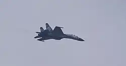 In 2014 during the Annexation of Crimea, a Ukrainian Air Force Su-27 was scrambled to intercept Russian fighter jets over Ukraine's airspace over the Black Sea on 3 March.[69] With no aerial opposition and other aircraft available for ground attack duties, Ukrainian Su-27s played only a small role in the war in Donbas until 24 February 2022. Ukrainian Su-27s were recorded performing low fly passes and were reported flying top cover, combat air patrols and eventual escort or intercept of civil aviation traffic over Eastern Ukraine.[70][71] Videos taken of low-flying Su-27s involved in the operation revealed they were armed with R-27 and R-73 air-to-air missiles.[72]