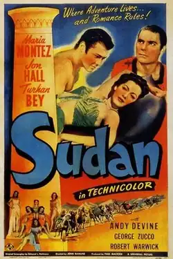 Sudan is a 1945 American Technicolor adventure film directed by John Rawlins and starring Maria Montez, Jon Hall and Turhan Bey.