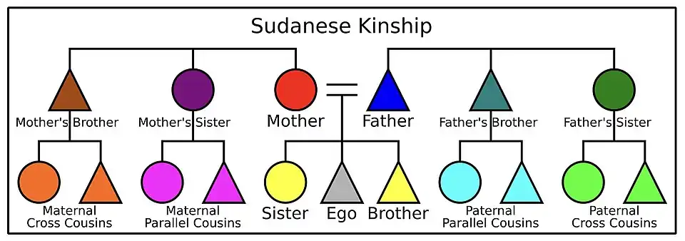 The Sudanese kinship system is the most complicated of all kinship systems. It maintains a separate designation for almost every one of Ego's (the individual's) kin, based on their distance from Ego, their relation, and their gender, and in some instances based on relative age.[1][2] The patrilineal and matrilineal line are differentiated. Ego's father is distinguished from Ego's father's brother and from Ego's mother's brother; Ego's mother is similarly distinguished from Ego's mother's sister and from Ego's father's sister; et cetera.[3] For cousins, there are up to eight possible terms.