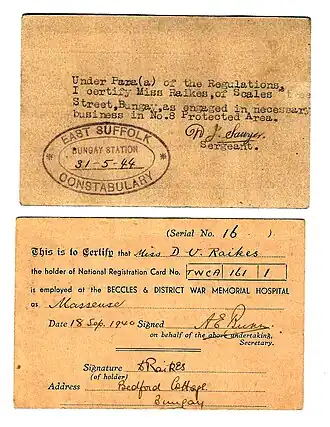 WWII pass from East Suffolk Constabulary allowing Bungay-living Miss Daphne Raikes, the Beccles & District War Memorial Hospital physiotherapist, to visit patients in the local wartime-protected Suffolk coastal area.
