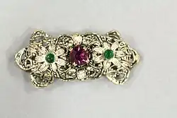 Suffrage jewellery refers to jewellery worn by suffragists, including suffragettes, in the years immediately preceding the First World War, ranging from the homemade to the mass-produced to fine, one-off Arts and Crafts pieces. Its primary purpose was to demonstrate its wearer's allegiance to the cause of women's suffrage in the UK. Jewellery was a key mechanism used by British suffragists to identify themselves.[1]