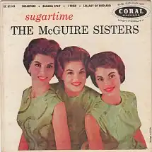 "Sugartime" is a popular song written by Charlie Phillips and Odis Echols, and published in 1957. The biggest hit version was by the McGuire Sisters, whose recording of it topped the Most Played chart in February 1958.[2] It was also the second number 1 Billboard single for the trio after 1954's "Sincerely". The song refers to the Jimmie Rodgers tune "Honeycomb", which had been recorded a few months earlier in 1957.
