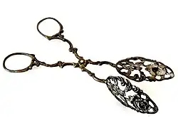 The early tongs were scissor-like, occasionally in fancy shapes like storks with long beaks[8] or puppets grabbing the sugar with their hands.[3] The majority at the time were "sugar bows" with two elaborately decorated hands with openwork that were joined by a flexible arc hammered into a spring, so that the hands opened when no pressure was applied to the arms.[8] The latter part of the reign of George II and early reign of George III exhibited a very large variety of patterns pierced and chased onto the tongs.[9] In the late Georgian era piercing popularity had declined, and the thongs were made to match the contemporary spoon designs (for example, with the fiddle pattern).[10]