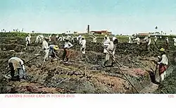 Sugarcane was an ancient crop of the Austronesian and Papuan people. The best evidence available today points to the New Guinea area as the site of the original domestication of Saccharum officinarum.[3] It was introduced to Polynesia, Island Melanesia, and Madagascar in prehistoric times via Austronesian sailors. It was also introduced by Austronesian sailors to India and then to Southern China by 500 BC, via trade. The Persians and Greeks encountered the famous "reeds that produce honey without bees" in India between the sixth and fourth centuries BC. They adopted and then spread sugarcane agriculture.[4] By the eighth century, sugar was considered a luxurious and expensive spice from India, and merchant trading spread its use across the Mediterranean and North Africa. In the 18th century, sugarcane plantations began in the Caribbean, South American, Indian Ocean, and Pacific island nations. The need for sugar crop laborers became a major driver of large migrations, some people voluntarily accepting indentured servitude[5] and others forcibly imported as slaves.[6]