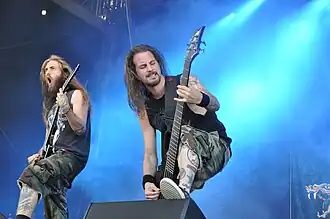 Suicide Silence performs deathcore,[66][67][68] which is a fusion between death metal and metalcore.[69] They are influenced by black metal, grindcore, mathcore and groove metal.[70][71][72][73][74] The mathcore elements can be seen in the varied speed changes and complex time signatures in the band's music. The vocals fluctuate between death growls used in death metal and high-pitched screamed vocals used in black metal, combined with anti-religious lyrics, though, later down the line of their career, they switched to discussing more personal issues.[74] The drumming is very fast-paced, grindcore-influenced, and employs a liberal use of double bass drumming and blast beats.[75] On Suicide Silence's third album The Black Crown, the group began to experiment with some slight nu metal styles.[76] This influence was fully pursued on their self-titled album, which is credited as a pure nu metal record.[77][78] In spite of this, the band reverted to their deathcore style on their sixth record Become the Hunter (2020).[79]