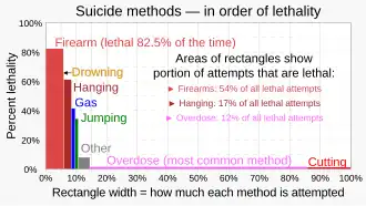 In the United States, suicide by firearm is the most lethal method of suicide, resulting in a fatality 90% of the time,[29] and is thus the leading cause of death by suicide as of 2017.[71] Worldwide, firearm prevalence in suicides varies widely, depending on the acceptance and availability of firearms in a culture. The use of firearms in suicides ranges from less than 10% in Australia[72] to 50.5% in the U.S., where it is the most common method of suicide.[73]