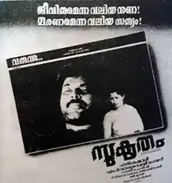 Sukrutham (transl. Good deed) is a 1994 Malayalam-language film directed by Hari Kumar and written by M. T. Vasudevan Nair. It stars Mammootty, Shanthi Krishna, Gautami, and Manoj K. Jayan.[2] Bombay Ravi had composed the songs while the background music was provided by Johnson. The film won two national awards/; National Film Award for Best Feature Film in Malayalam and the National Film Award for Best Music Direction.
