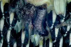 The larvae feed on Helianthus species. They tunnel into the stalks and buds of their host plant.
