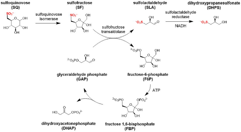 • The sulfofructose transaldolase pathway, first identified in Bacillus aryabhattai [5] and Bacillus megaterium,[6] involves isomerization of SQ to sulfofructose, and then a transaldolase cleaves SF to 3-sulfolactaldehyde (SLA), while the non-sulfonated C3-(glycerone)-moiety is transferred to an acceptor molecule, glyceraldehyde phosphate (GAP), yielding fructose-6-phosphate (F6P). The SLA released can either be oxidized (to sulfolactate) or reduced (to dihydroxypropanesulfonate) and then excreted.