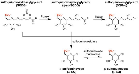 Sulfoquinovose is rarely found in its free form in nature; rather it occurs predominantly as a glycoside, SQDG. SQDG can be deacylated to form lyso-SQDG and sulfoquinovosylglycerol (SQGro).[14][15][16] Sulfoquinovose is obtained from SQ glycosides by the action of sulfoquinovosidases, which are glycoside hydrolases that can hydrolyse the glycosidic linkage in SQDG, or its deacylated form, sulfoquinovosyl glycerol (SQGro).[17]