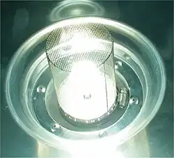 The sulfur lamp consists of a golf ball-sized (30 mm) fused-quartz bulb containing several milligrams of sulfur powder and argon gas at the end of a thin glass spindle. The bulb is enclosed in a microwave-resonant wire-mesh cage. A magnetron, much like the ones in home microwave ovens, bombards the bulb, via a waveguide, with 2.45 GHz microwaves. The microwave energy excites the gas to five atmospheres pressure, which in turn heats the sulfur to an extreme degree forming a brightly glowing plasma capable of illuminating a large area. Because the bulb heats considerably, it may be necessary to provide forced air cooling to prevent it from melting. The bulb is usually placed at the focus of a parabolic reflector to direct all the light in one direction.